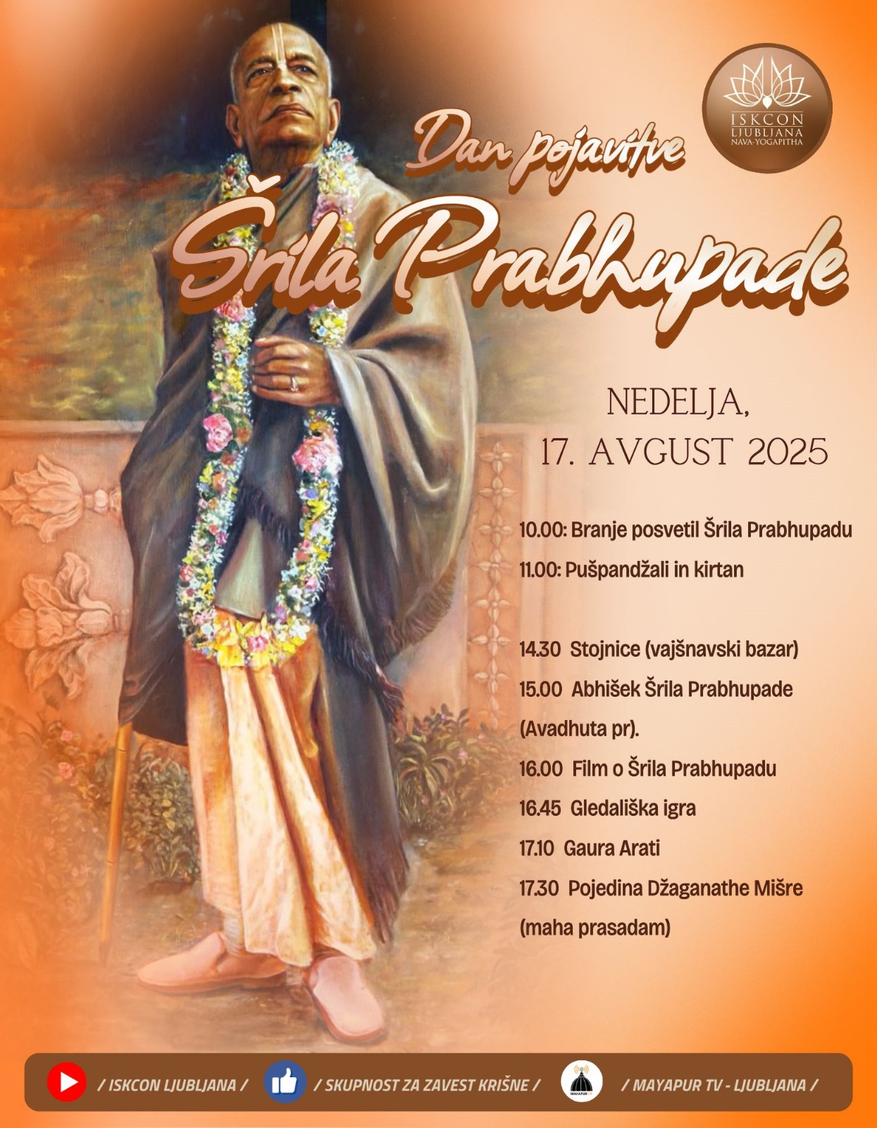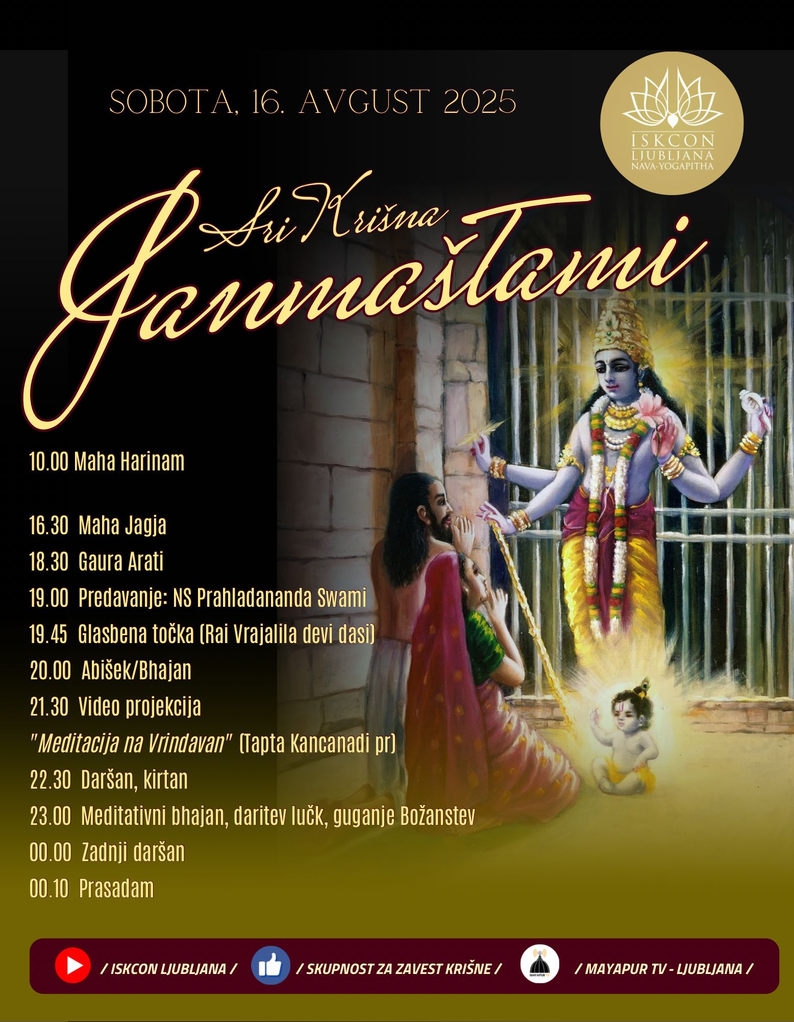 Slovenska Poletna Jatra vas vabi na DUHOVNI UMIK 2025 - »Japa duhovni umik z NM Mahatmo prabhujem Hare Krišna, dragi bhakte! Prosimo, sprejmite naše ponižno spoštovanje! Vsa slava Šrila Prabhupadu! Lepo vabljeni na 5-dnevno nepozabno transcendentalno izkušnjo na DUHOVNI UMIK, ki bo potekal sredi gozdov na idiličnem Pohorju. Pošiljamo vam samo osnovno informacijo tako da […]