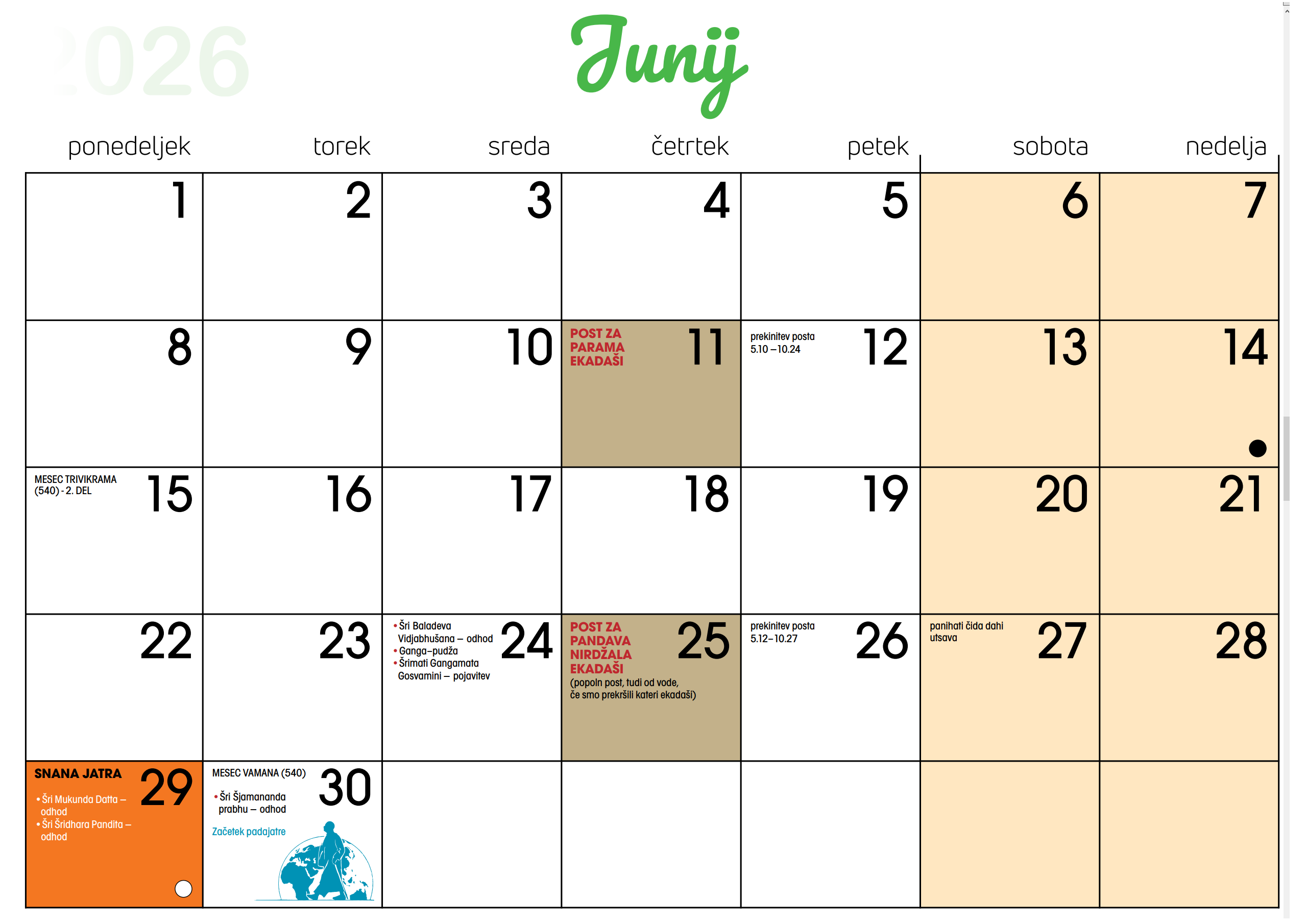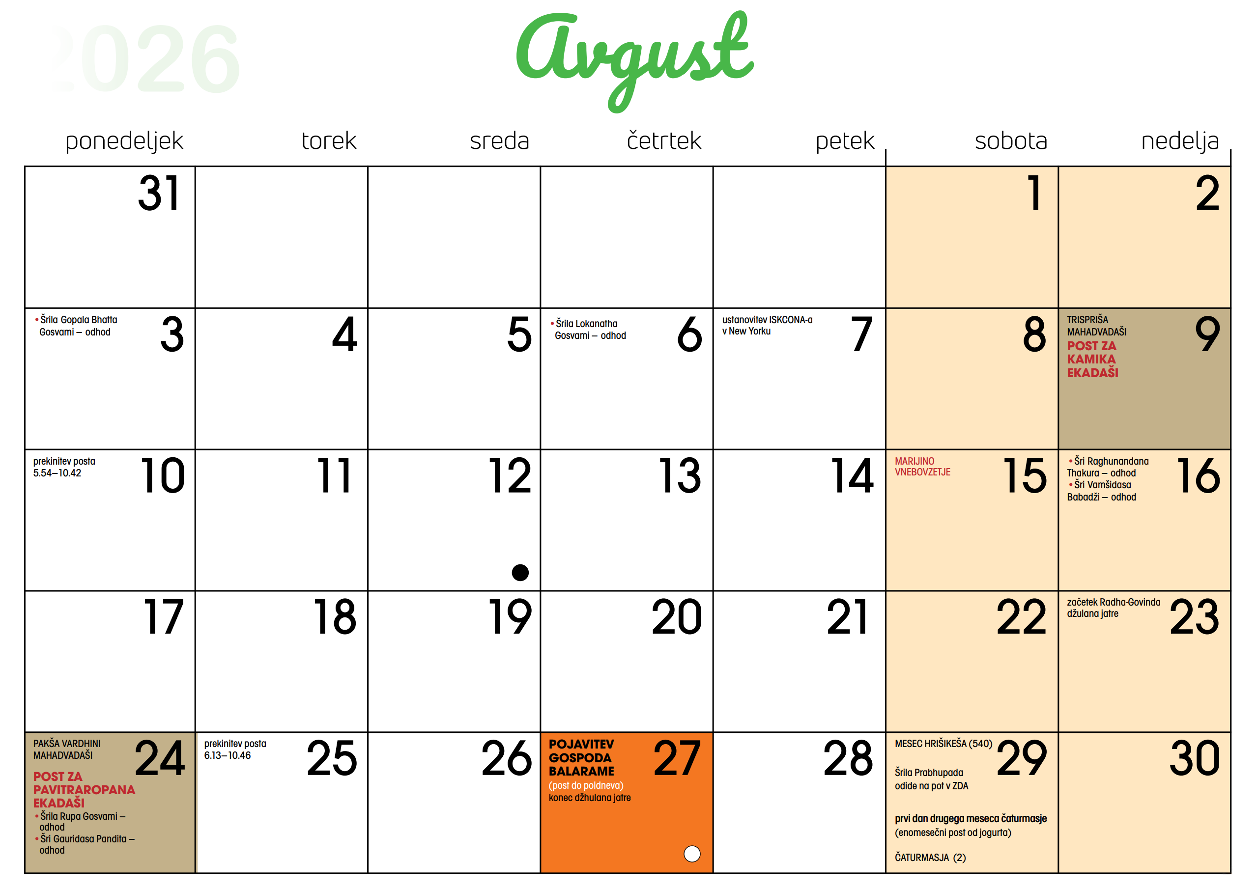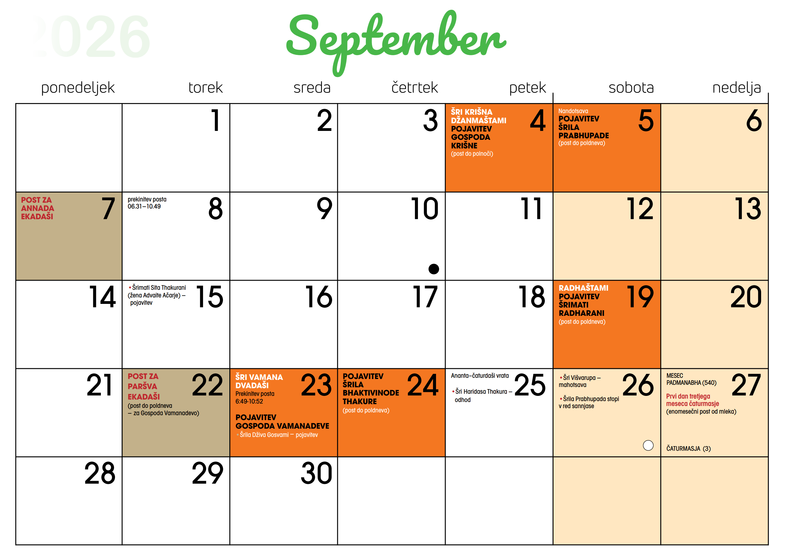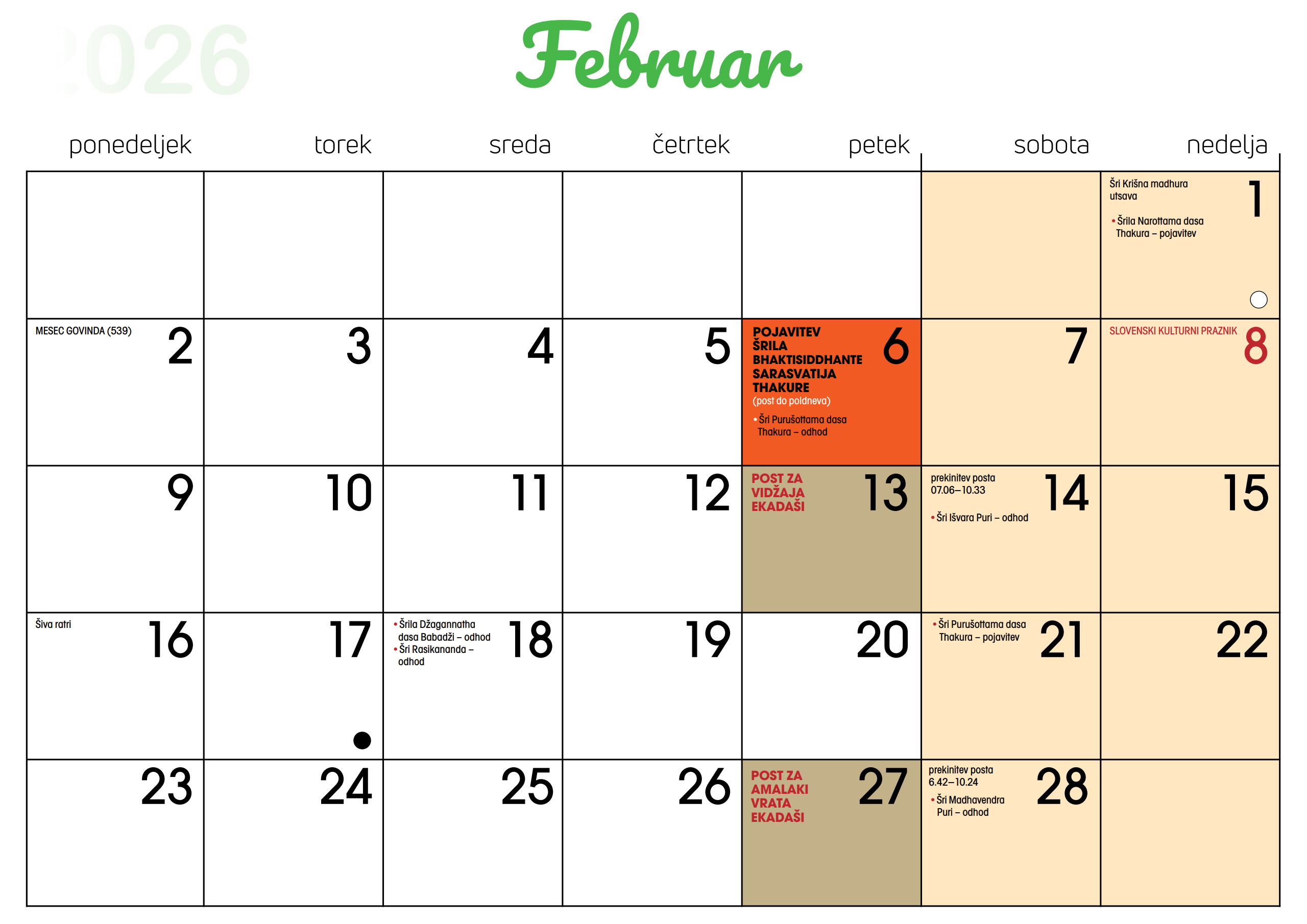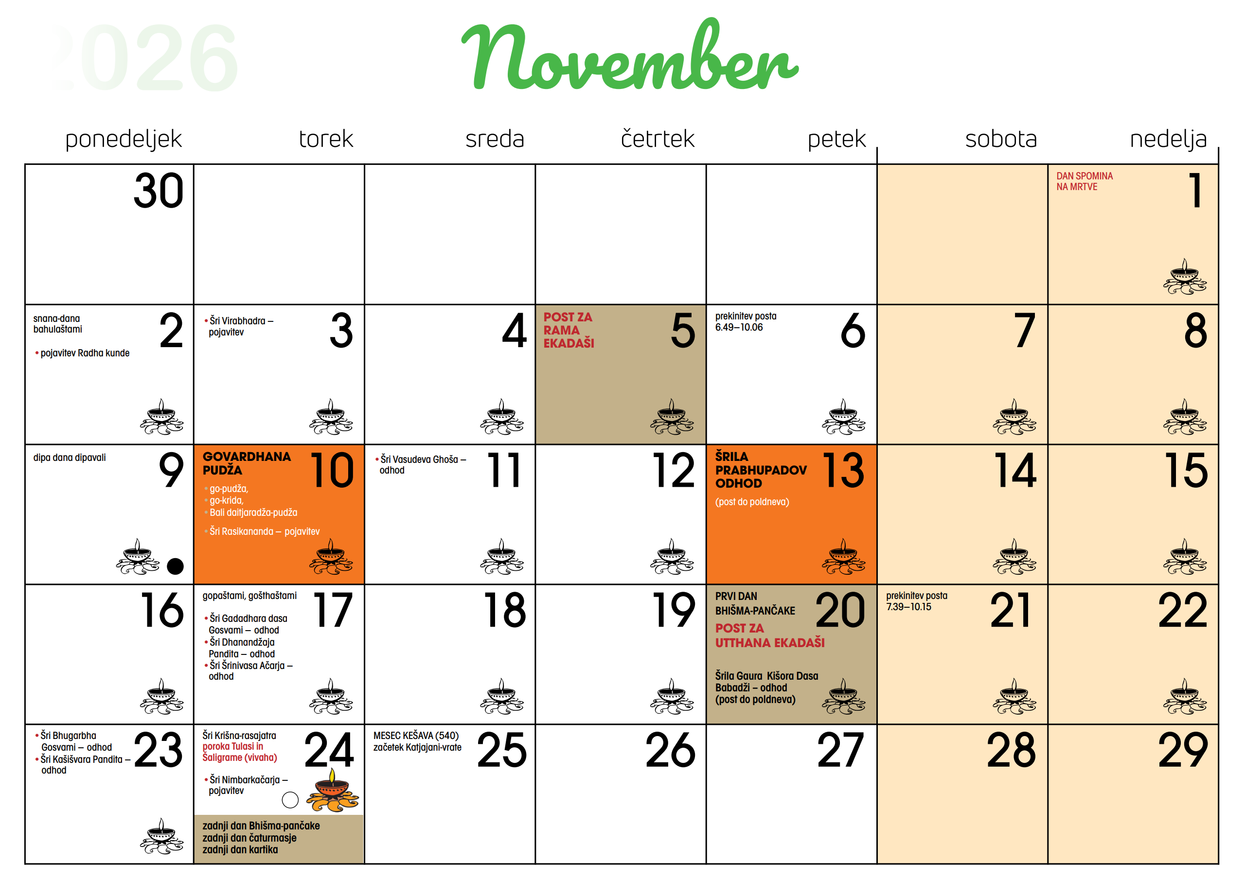 Koledar dogodkov v Centru Hare Krišna v Ljubljani