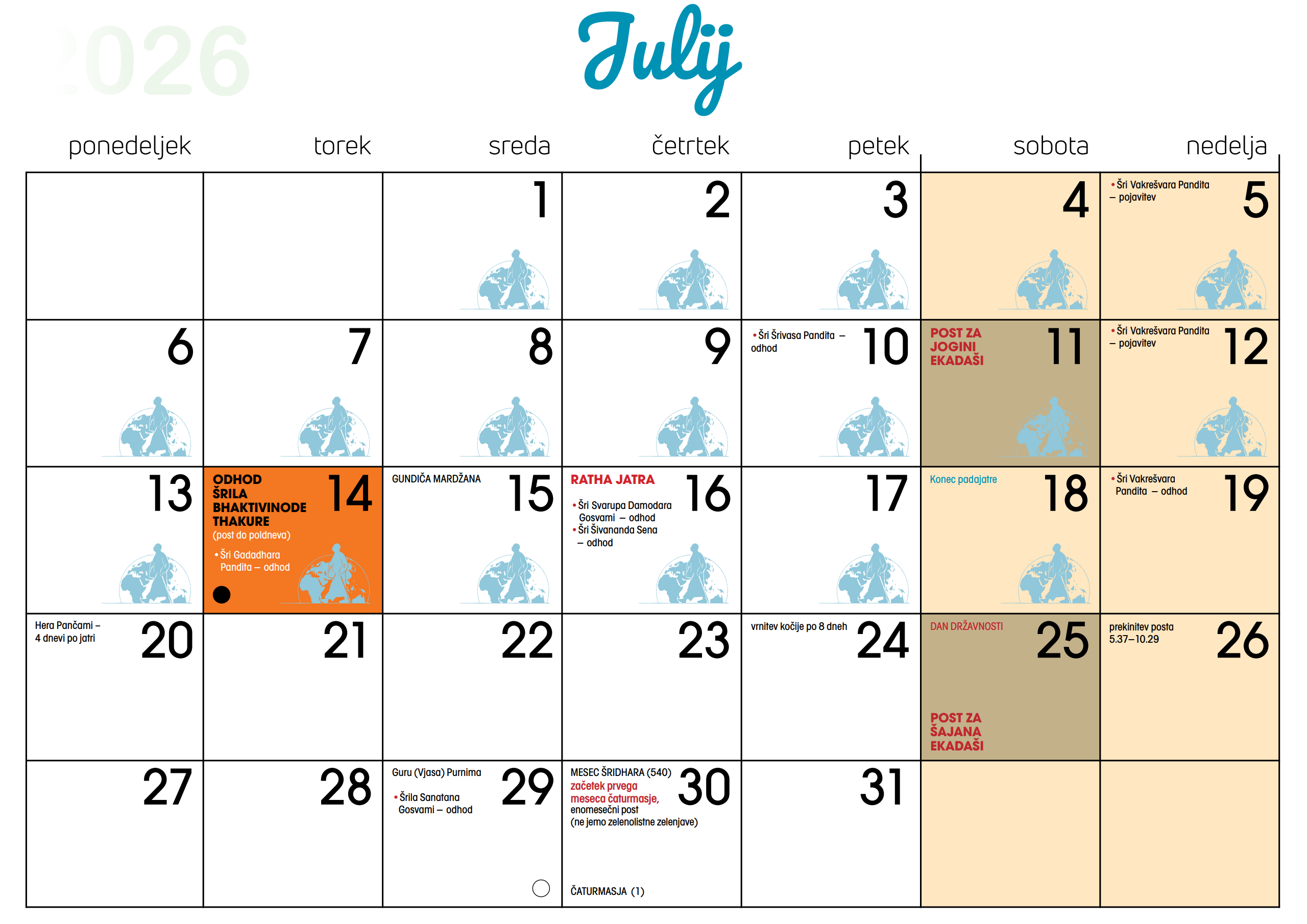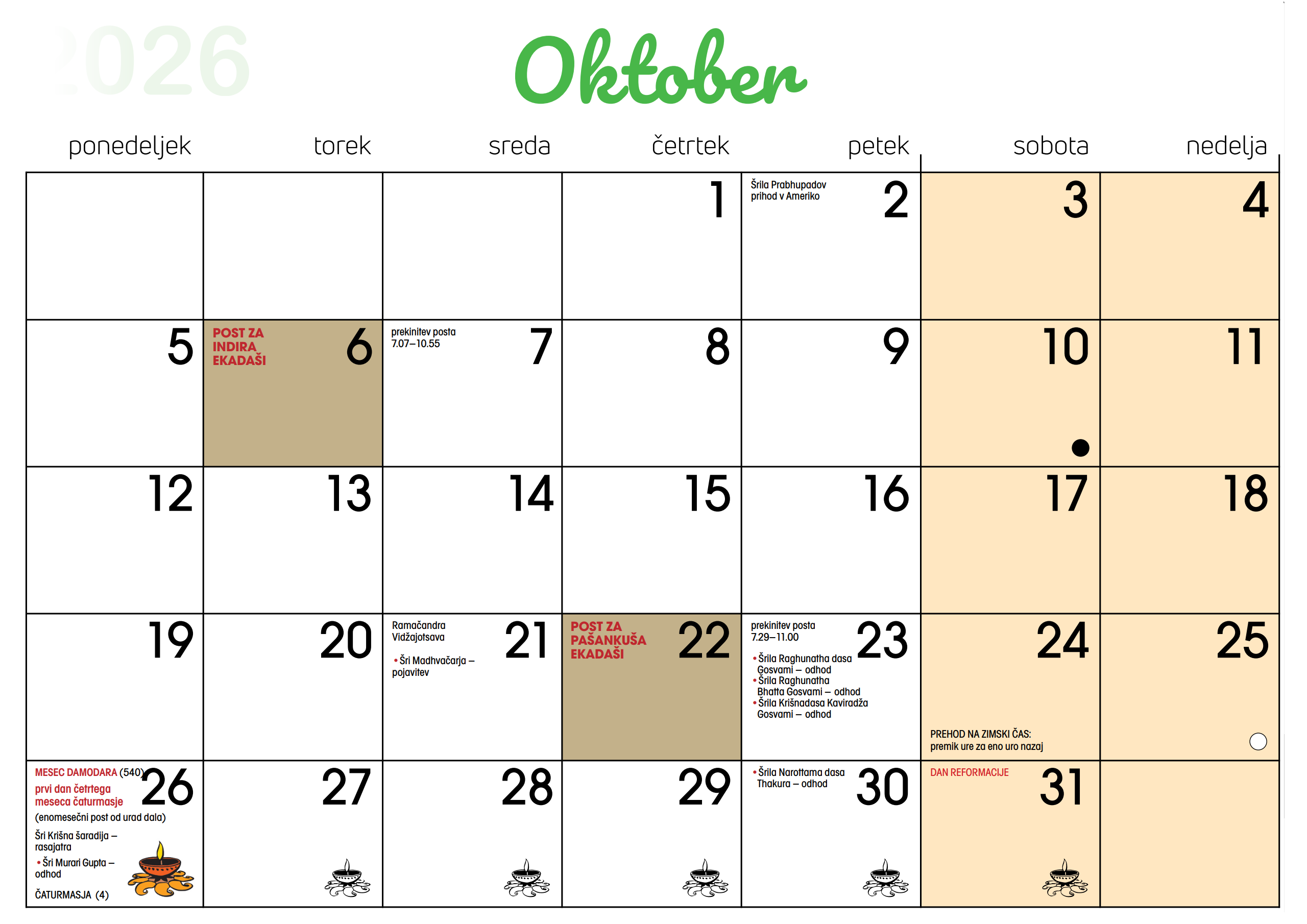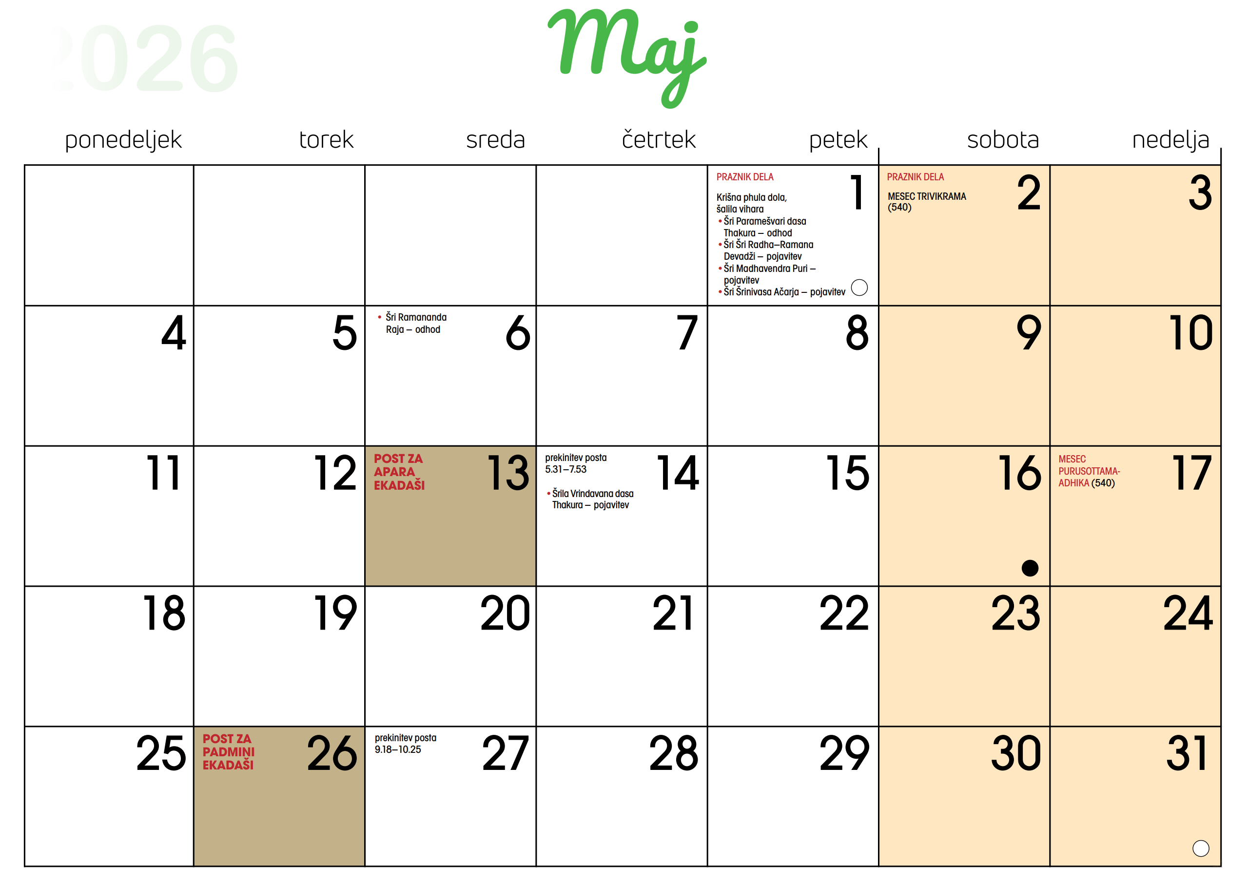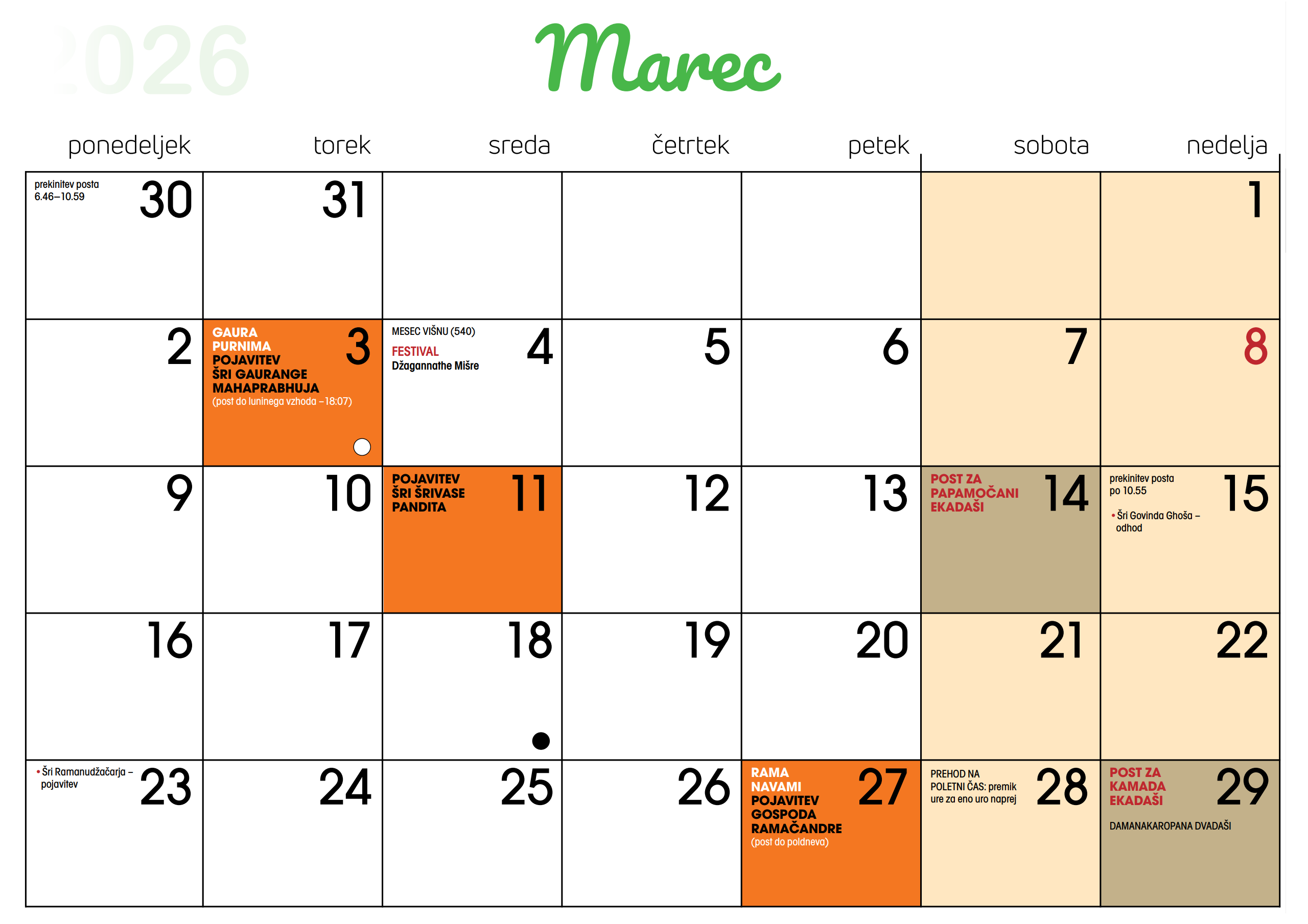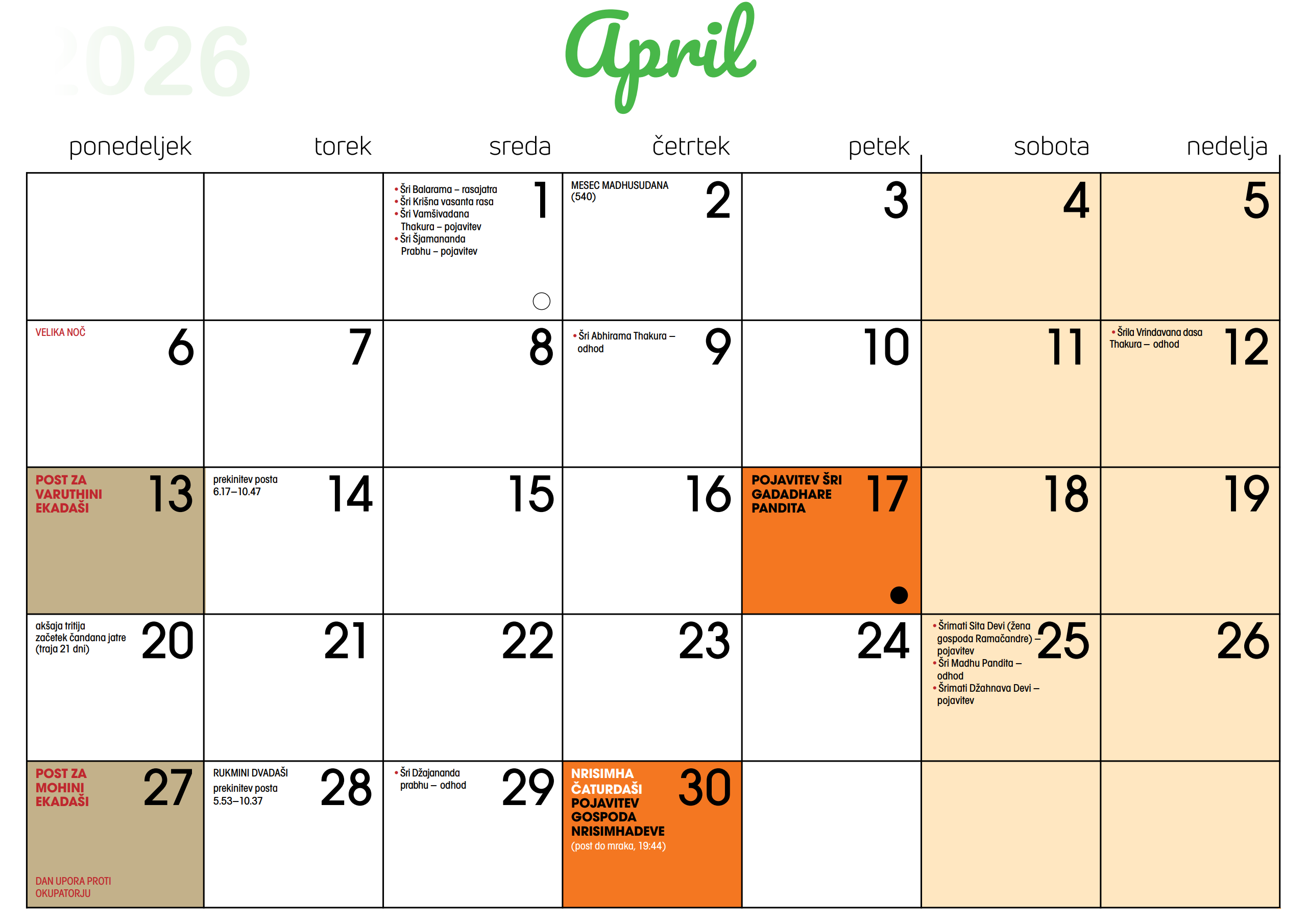 Koledar dogodkov v Centru Hare Krišna v Ljubljani